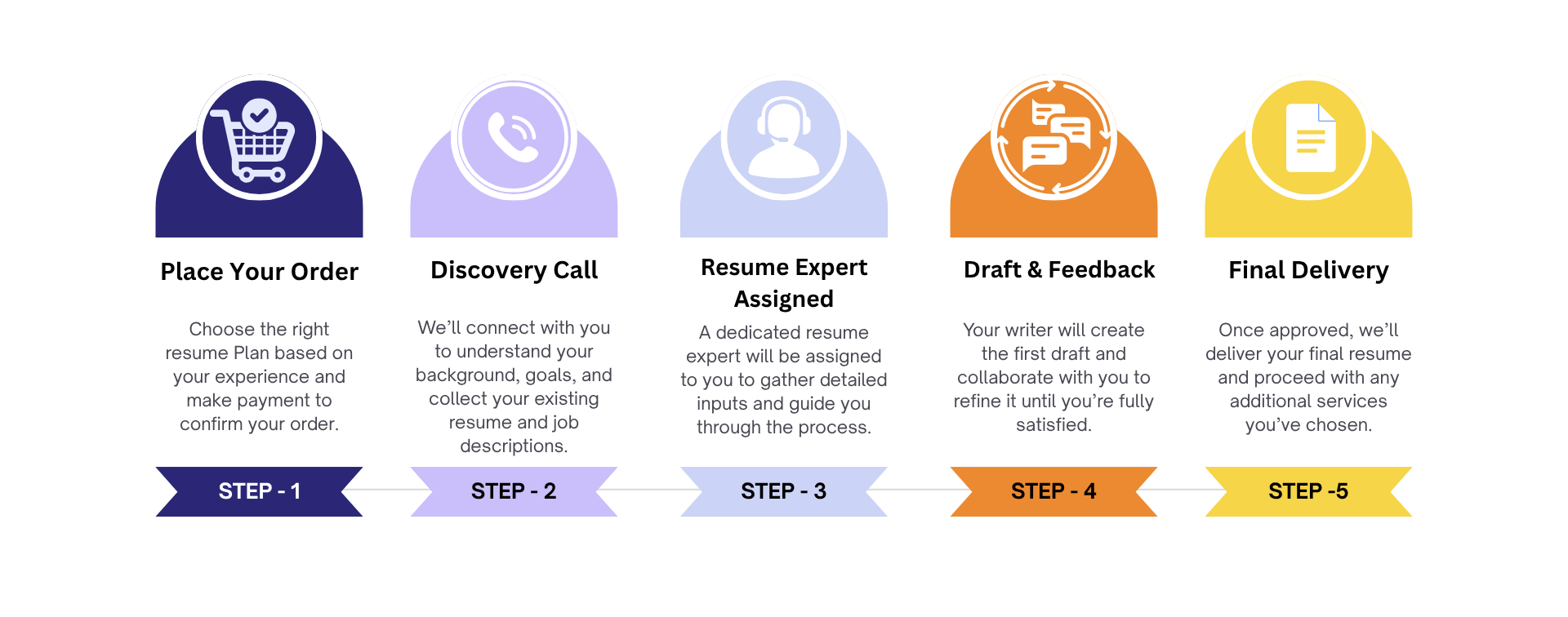 We will assign you a resume consultant / writer that will call you to discuss resume inputs in detail → Writer will write draft based on inputs collected → Iterate draft based on your feedback until you are satisfied →