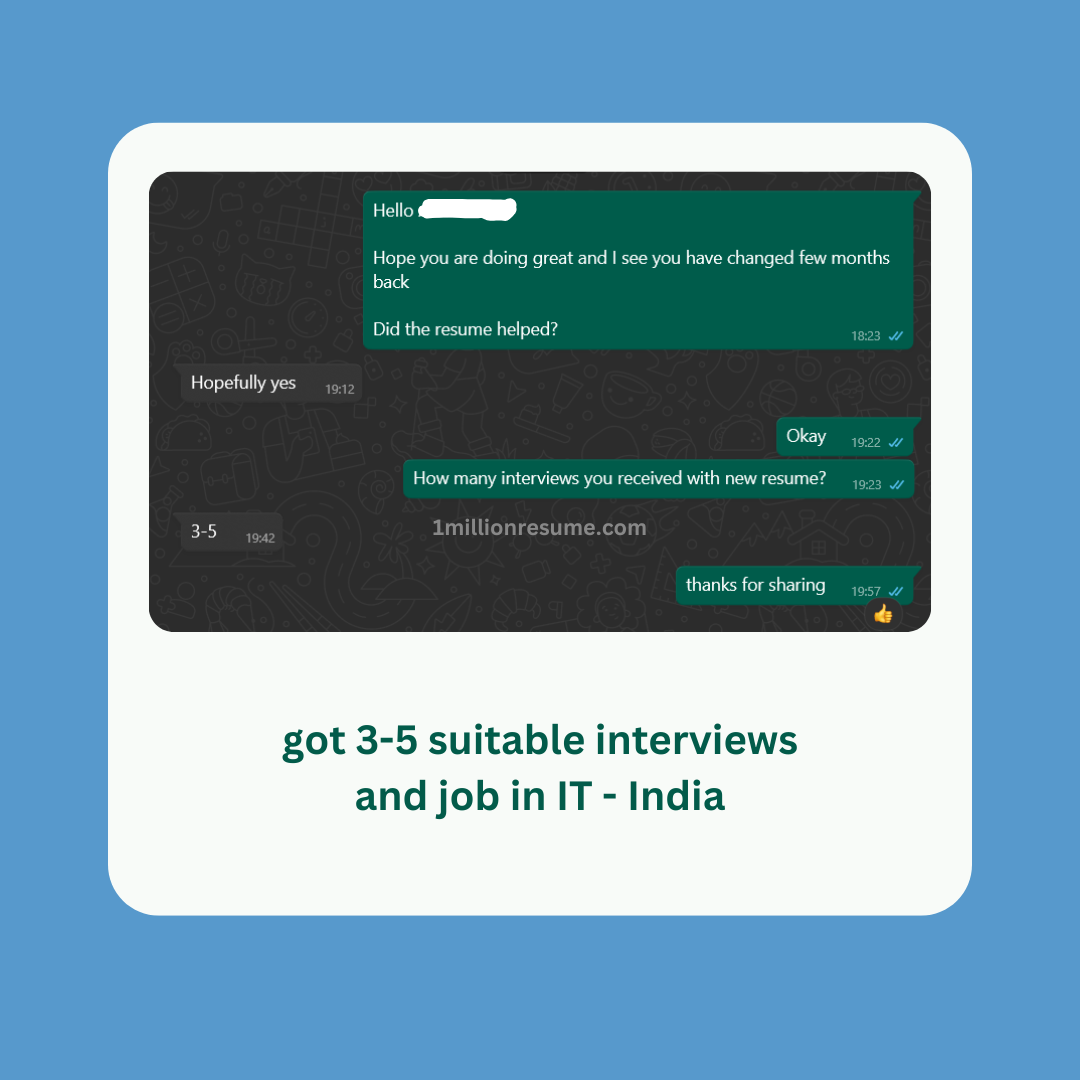 The results speak for themselves. Since using 1millionresume.com, I've seen a significant increase in my resume selection rate and job opportunities. 1millionresume helped me get a new Job with CTC jump from 34 LPA to 50 LPA. I can't recommend 1millionresume.com enough to anyone looking to enhance their job prospects.
